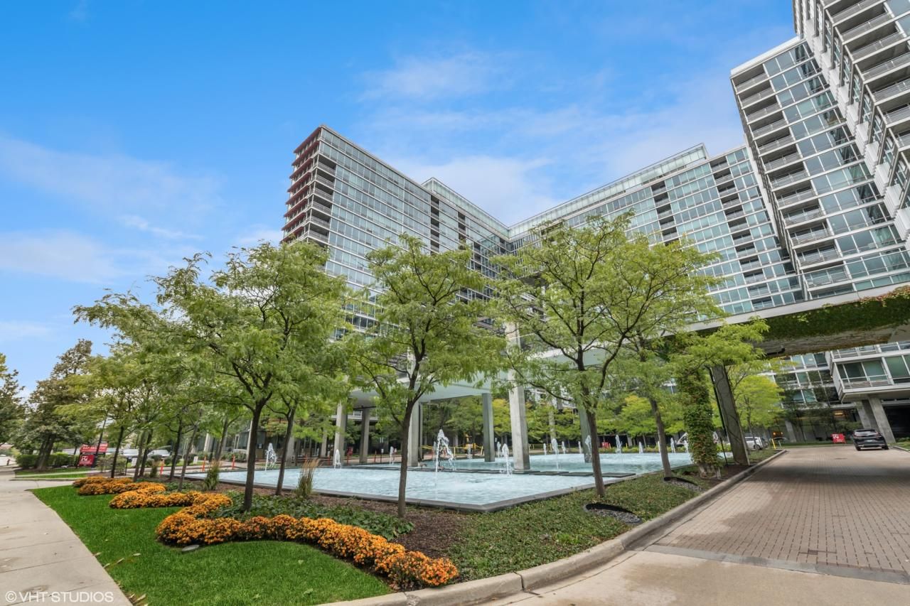 MODEL UNIT in Optima Towers with 2 GARAGE SPACES INCLUDED. This impeccably kept contemporary unit has an open floor plan with large foyer, perfect for Office or Dining area. Floor to ceiling windows in the Living Room and both Bedrooms flood the unit with light and overlook the picturesque courtyard with fountains. (Some other units overlook the parking lot or expressway) A balcony off the Living Room also overlooks the courtyard. Top of the line Kitchen with Bosch gas cooktop, Subzero refrigerator and freezer drawers, Miele dishwasher, wine refrigerator, and appliance cabinet. Washer/dryer in unit. Both Bedrooms feature tons of custom closet space. HOA includes heat, AC, gas, cable TV, internet, water, and amenities. High amenity building has indoor pool, hot tub, sundeck,tennis court, pickleball, and fitness room. Tons of guest parking and EV charging in the garage. Prime location next to Harms Woods. Just 6 blocks to Old Orchard Mall.